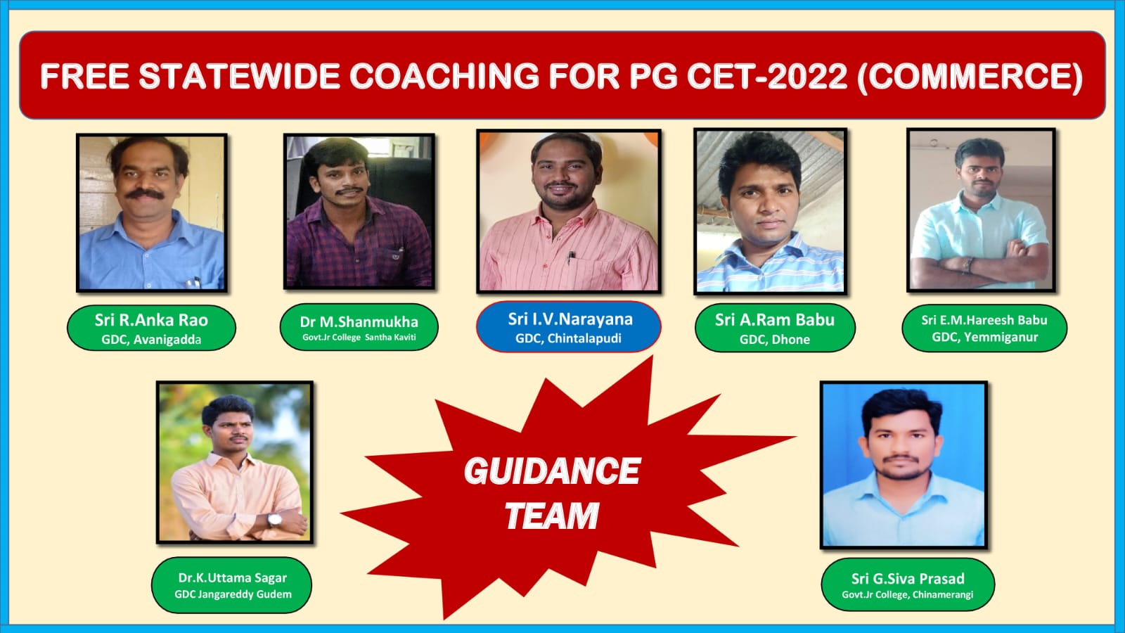 Sri I.V.Narayana, Lecturer in Commerce, GDC Chintalapudi, Career Guidance Cell and JKC Training Wing of GDC Chintalapudi has stepped forward with a group of Commerce faculty to provide techniques and guidance to students who have completed B.Com (G&V) from state-wide Degree Colleges and are preparing for PG CET 2022 to join M.Com with a good rank in state Universities. Around 230 pupils have joined and are adhering to the guidelines. The programme organizers are 1) Sri I.V.Narayana, Lecturer in Commerce, GDC, Chintalapudi 2) Sri R. Ankara Rao Lecturer in Commerce, GDC, Avanigadda 3) Dr.M.Shanmukha, Lecturer in Commerce Govt Jr. College, Santha Kaviti 4) Sri E.M. Hareesh Babu, Lecturer in Commerce, GDC , Yemkiganuru 5) Sri A.Ram Babu, Lecturer in Commerce GDC , Dhon 6) Dr.K.Uttama Sagar, Lecturer in Commerce GDC ,Jangareddy Gudem 7) Sri G.Siva Prasad, Lecturer in Commerce Govt Jr. College, Chinamerangi. Instruction and courses are supplied through a Whatsapp group, and online classes are delivered using Zoom meetings.
